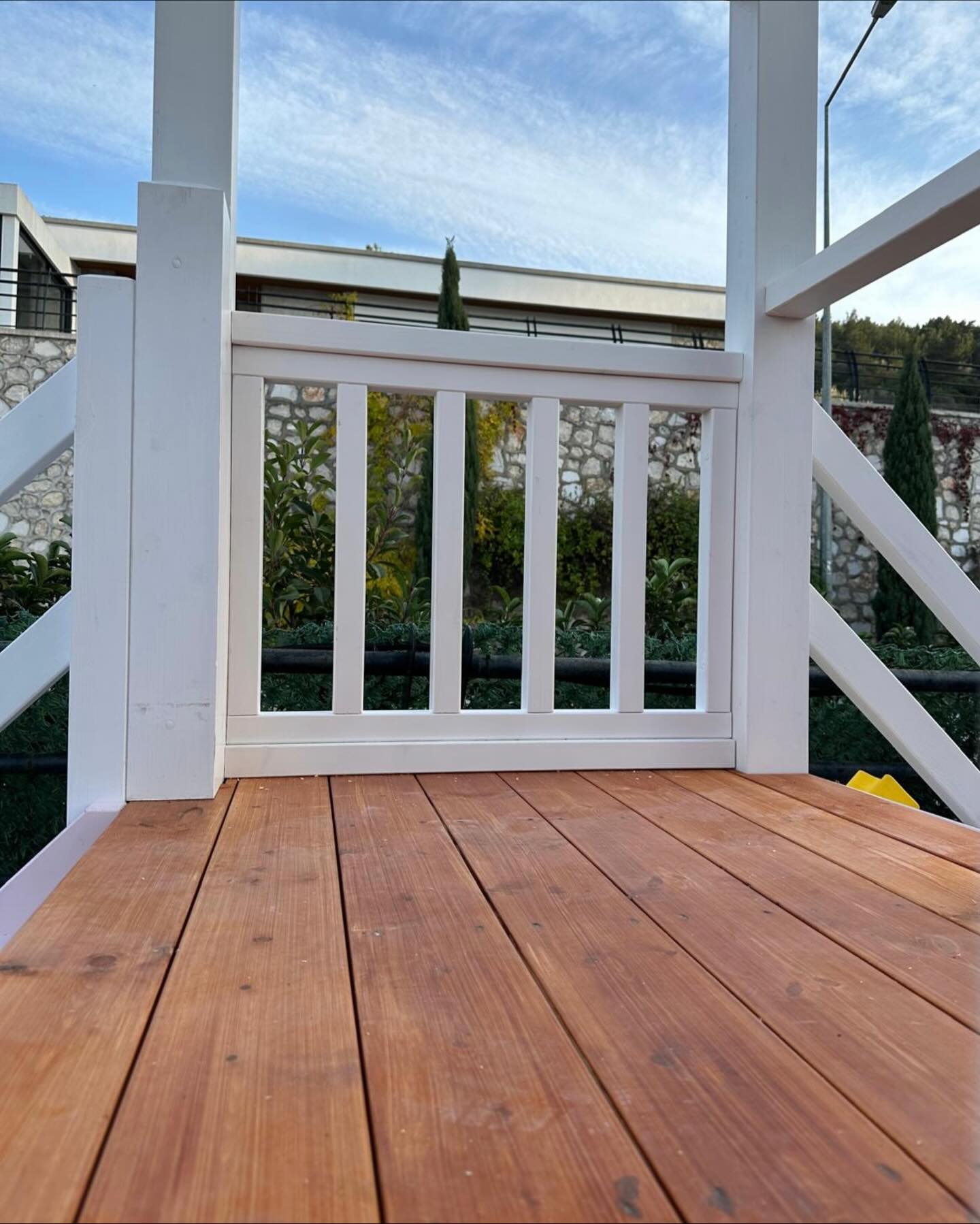 - Full safety railings with vertical spindles