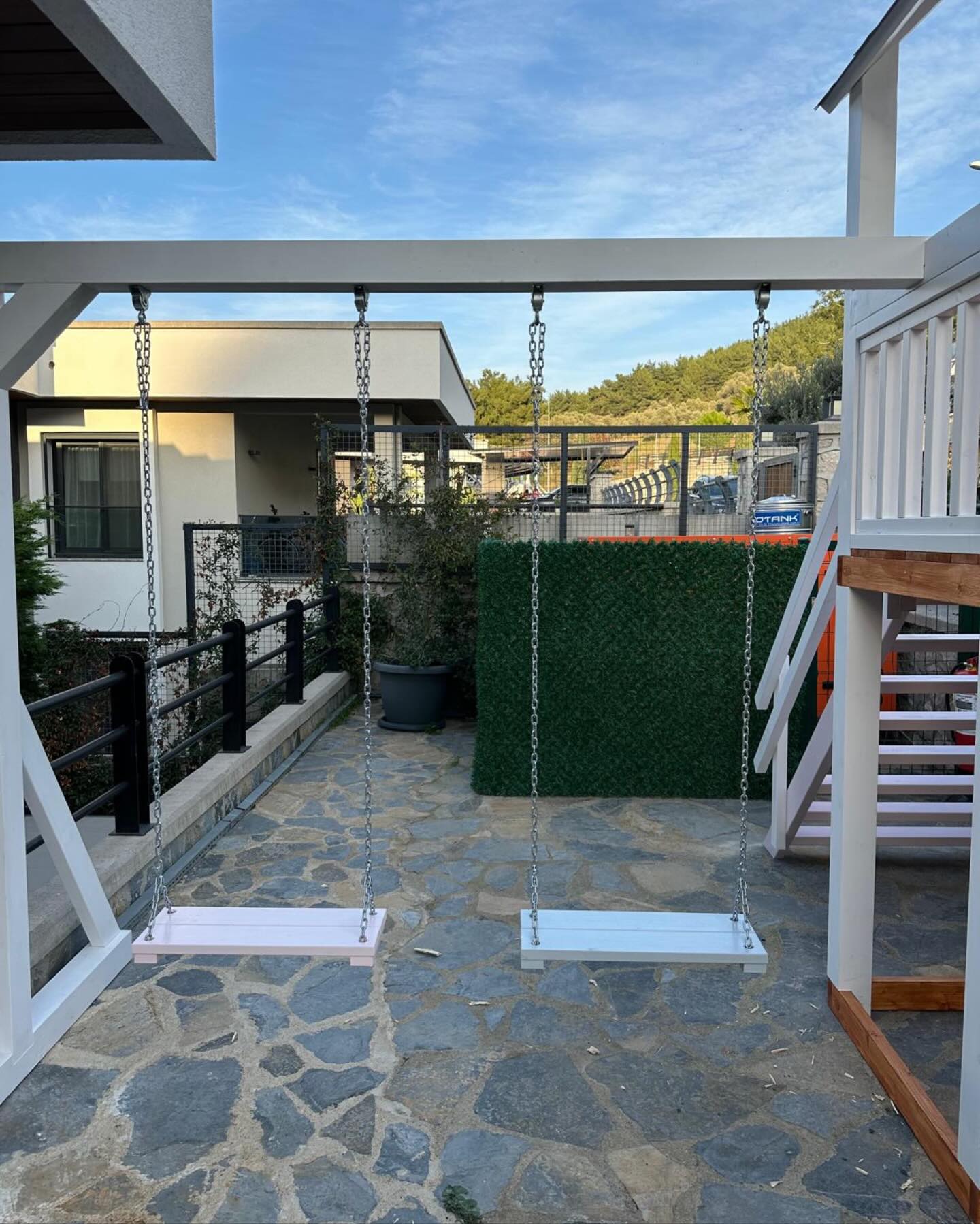 - Swing Set: Integrated double A-frame swing with contemporary aesthetic