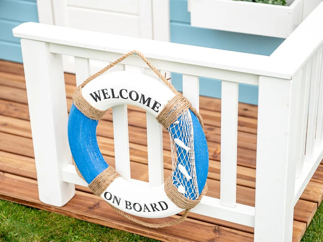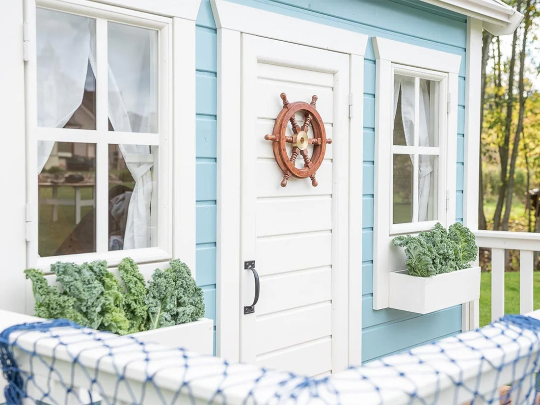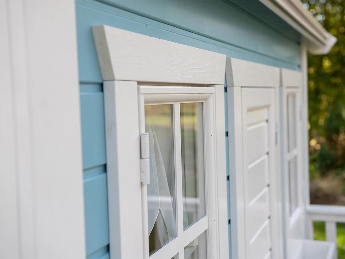 Inspired by the bluebird โ a symbol of joy and dreams, this light blue playhouse evokes the bright feathers of the mountain bluebird. White window frames, flower boxes, and terrace railings reflect its snowy belly, adding to the fairytale charm.