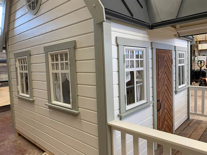 This handcrafted playhouse features a partially covered terrace supported by charming white columns, offering the perfect place for tea parties, crafting sessions, or quiet time in the shade. The interior is bright and cozy, with a second-floor loft, accessible by stairs, for little explorers to climb up and peek out at the world.