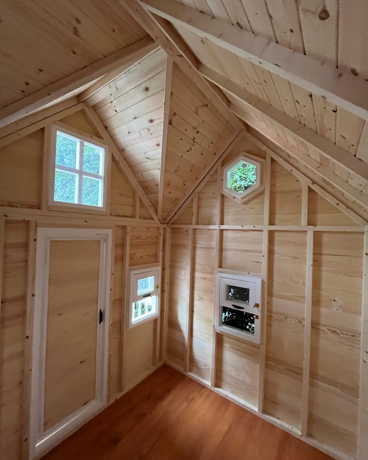 - Interior: Natural light pine wood walls and ceilings with rich orange-stained wood flooring